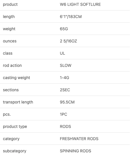 Westin W6 Light Softlure er bygget i Toray carbon og kombinerer lav vægt, høj følsomhed og styrke. Stangen er designet til ultra-light fiskeri og giver præcis kontrol og optimal føling med softbaits, perfekt til ørred og andre lette ferskvandsrovdyr.
