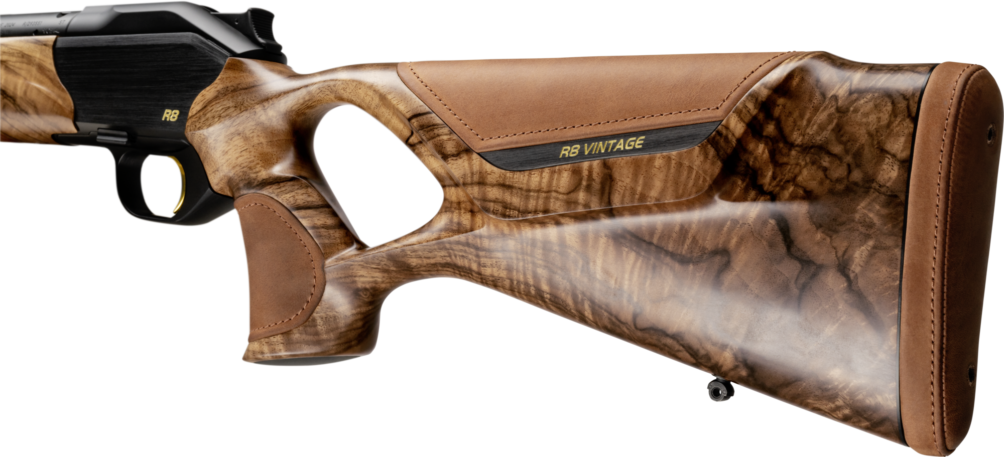 Diskrete detaljer som sort skæftebøjle med mat børstning og den guldfarvede “R8 Vintage”-inskription understreger riflens noble karakter uden at dominere helhedsindtrykket.